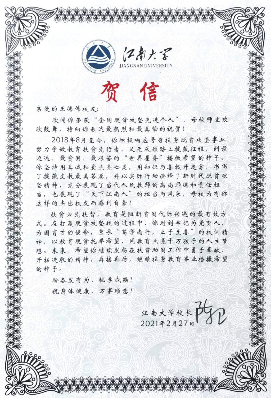 贺信表示,在打赢脱贫攻坚战的过程中,王德伟时刻牢记为党育人、为国育才的使命,秉承“笃学尚行,止于至善”的校训精神,坚持用真诚和爱点亮心灵,用知识与善拨开迷雾,书写了援藏支教最美答卷,以实际行动诠释了新时代脱贫攻坚精神,充分展现了当代人民教师的高尚师德和责任担当,也展现了“天下江南人”的担当与风采。希望王德伟继续发扬在扶贫助困工作中勇于奉献、开拓进取的精神,再接再厉,继续投身教育事业播撒希望的种子。