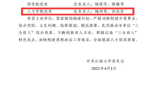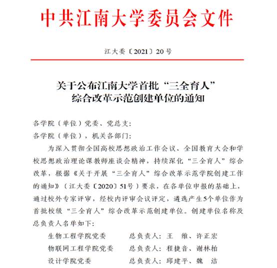 4月1日,350vip8888新葡的京集团发布《关于公布350vip8888新葡的京集团首批“三全育人”综合改革示范创建单位的通知》(江大委【2021】20号文),我院党委入选首批示范创建单位。