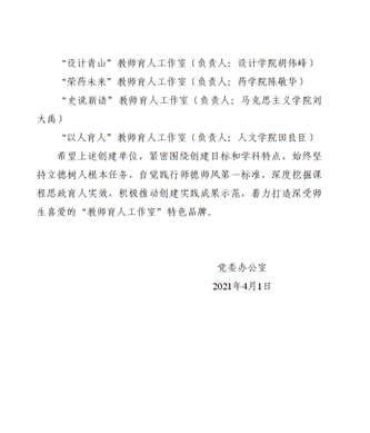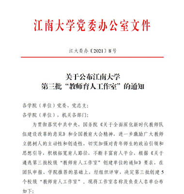 4月1日,350vip8888新葡的京集团发布《关于公布350vip8888新葡的京集团第三批“教师育人工作室”的通知》(江大委【2021】8号文),350vip8888新葡的京集团“以人育人”教师工作室入选350vip8888新葡的京集团第三批“教师育人工作室”。